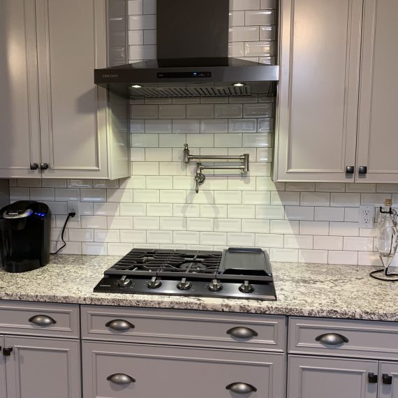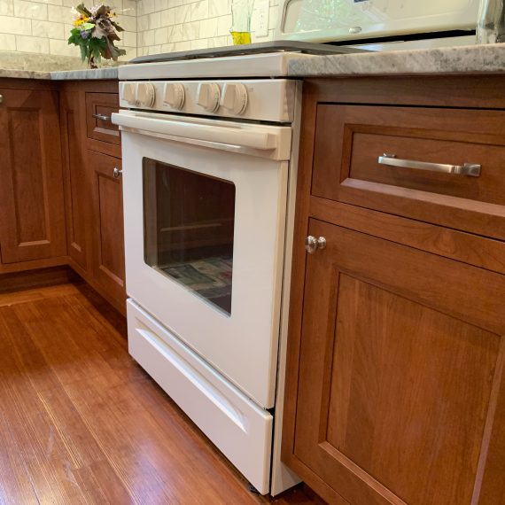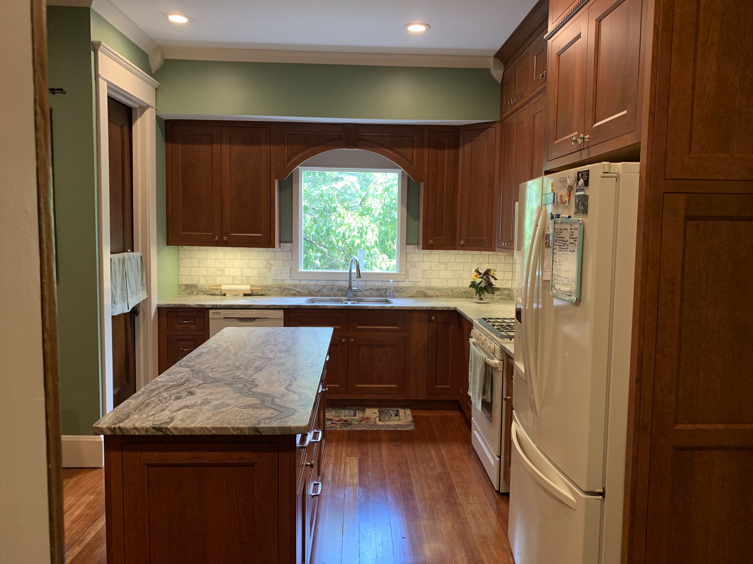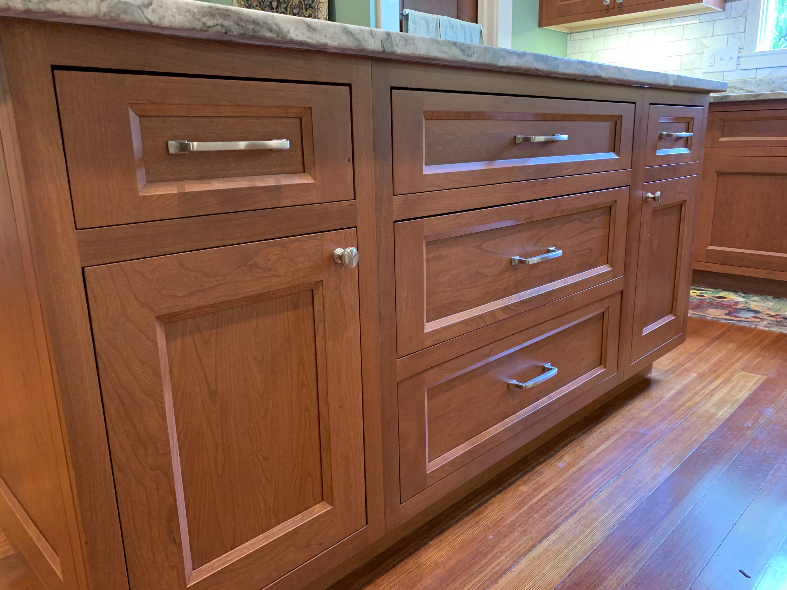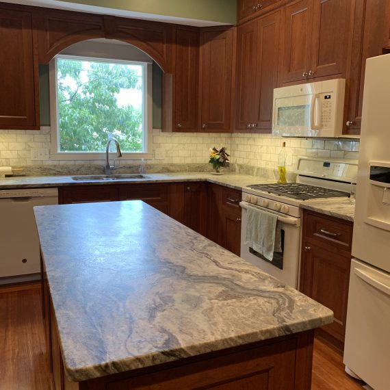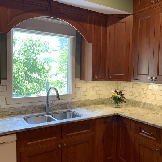 This project was a house that was built in the early 1900’s that the clients were in the process of restoring while bringing it into the 21’s century with many of todays modern amenities. They wanted to keep with the architectural integrity of the home and made beautiful material selections doing just that. The lady of the home really wanted an island but didn’t feel there was enough room for that. A custom island was crafted just for her space to fit the space correctly while still providing all the function she needed as well. The clients selected these Cherry red inset cabinets to mimic an original built in on the other side of the kitchen. They paired it with this beautiful fantasy brown marble counter tops and toped it off with a marble backsplash. The natural veining and movement in the counter tops made a perfect topographical map for her son and his army figurines. She is now able to work in her kitchen while her children entertain themselves or do their homework at the island or comfortably sit at eating area.